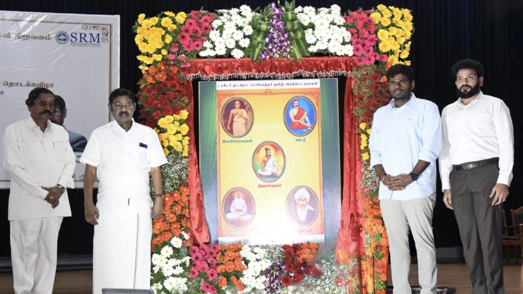 SRM Institute of Science and Technology (SRMIST), under the aegis of the Tamil Perayam, organised a grand “Mupperum Vizha” (Three-fold Celebration) today. The event brought together the inauguration of the Dr T.R. Paarivendhar Tamil Foundation, the presentation of the World Record certificate achieved in connection with the 150th anniversary of the song Vande Mataram, and the observance of Parakram Diwas, commemorating the valour and sacrifice of national heroes.
